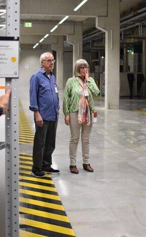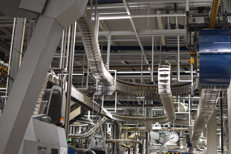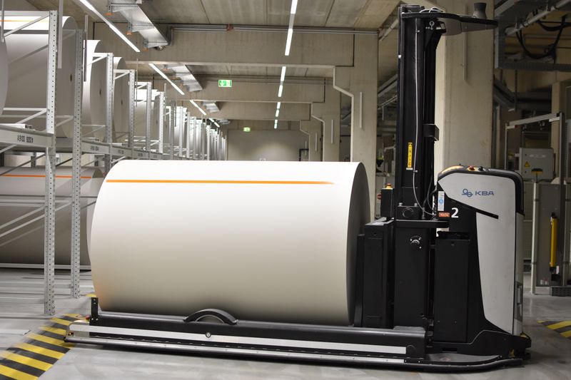 - Papierhalle mit den riesigen Papierrollen, wo Roboter die Druckmaschinen automatisch mit Papier bestücken. Dies passiert ohne Anhalten des Druckbetriebes,