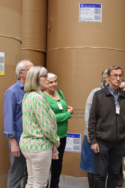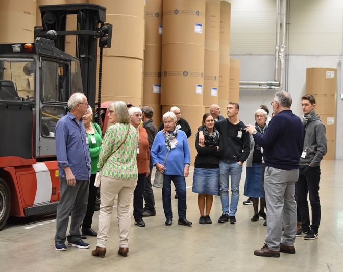 Wir hören unserem Verlagsexperten gespannt im Papierlager zu.